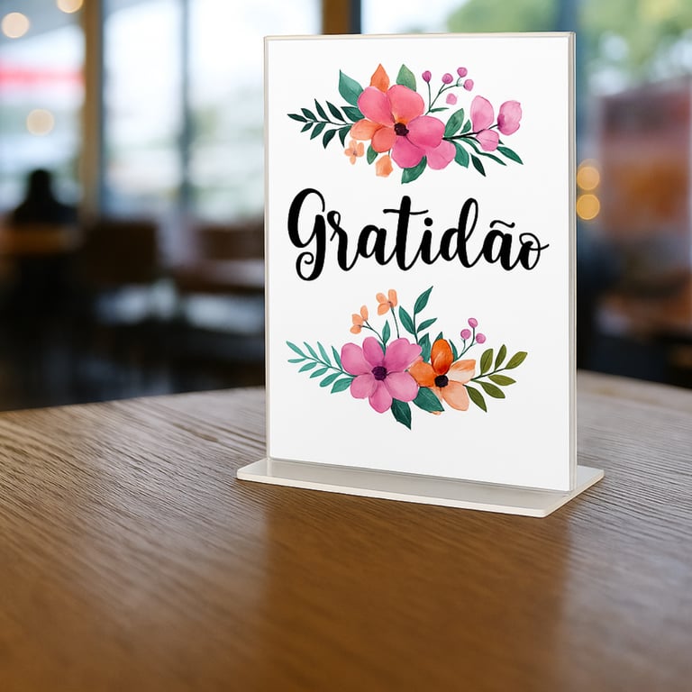 Displays de mesas com diversas frases e imagens